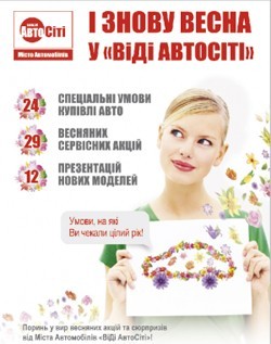 Клиенты, заключившие договор на покупку автомобиля в период с 1 марта по 30 апреля 2012 г., гарантированно получают «букет» весенних сюрпризов*: подарочную карту на посещение кинокомплекса «Синема Сити» (для Клиентов Одессы), подписку на популярный автомобильный еженедельник «Автоцентр» и Gold Card Программы Лояльности «ВиДи АвтоСити». В качестве приятного бонуса все покупательницы новеньких автомобилей получают персональную фотосессию с «четырехколесным другом» на территории автосалона, в котором заключат контракт на приобретение. Кроме того, каждый покупатель новенького авто, а также Клиент сервиса участвует в розыгрыше подарков от партнеров акции: 15 телевизоров SUMSUNG, 15 President Card Программы Лояльности «ВиДи АвтоСити», 15 сертификатов приятных впечатлений Best Moments, 15 полисов Автогражданки**.