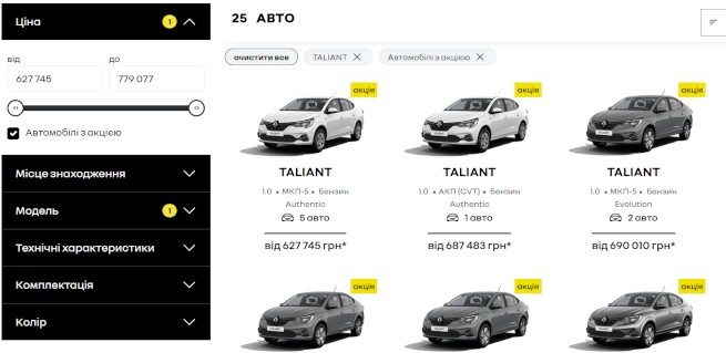 В рамках Акції клієнтам пропонується акційна ціна* на всі Renault Taliant 2024 року виробництва. Мінімальна ціна акційного авто – від 627 745 грн за програмою Renault Бонус**.