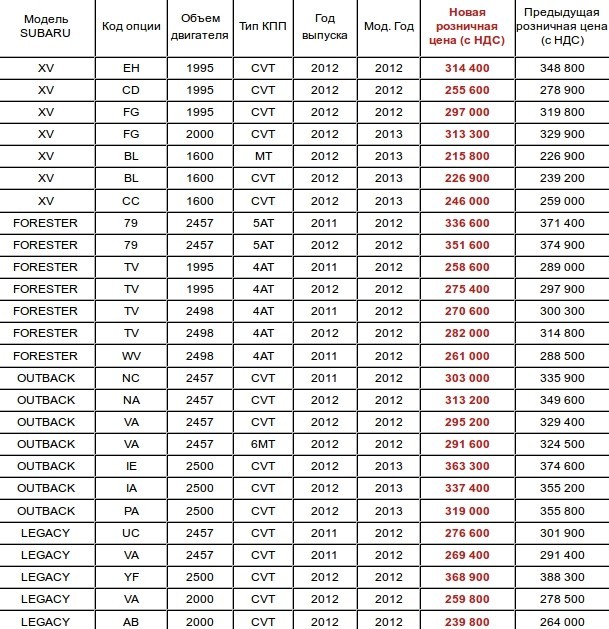 Предложение распространяется на все модели выпуска 2012 года. Среднее снижение цен составляет 7%. К примеру, бескомпромиссный кроссовер Forester 2012 года выпуска можно приобрести дешевле на 32 800 грн., седан бизнес-класса Legacy стал доступнее на 24 200 грн., компактный кроссовер XV и универсал Outback – на 34 400 и 36 400 грн. соответственно.